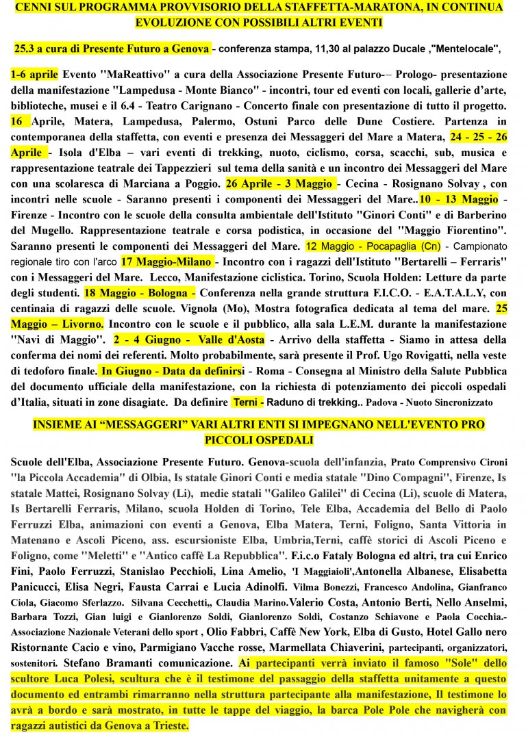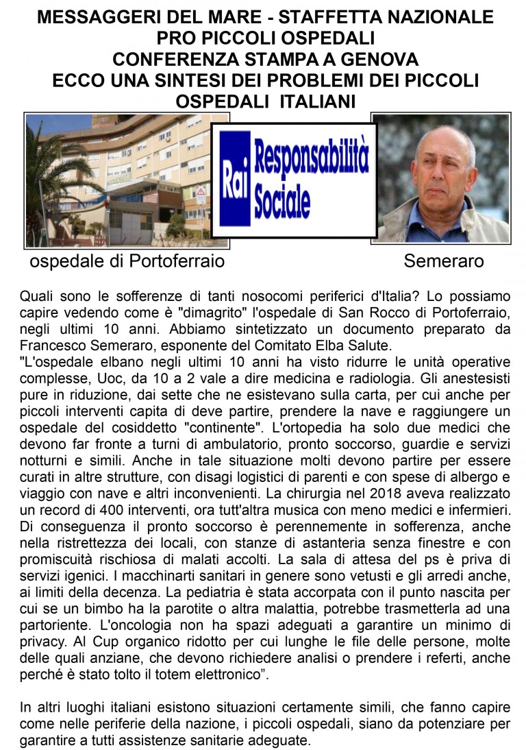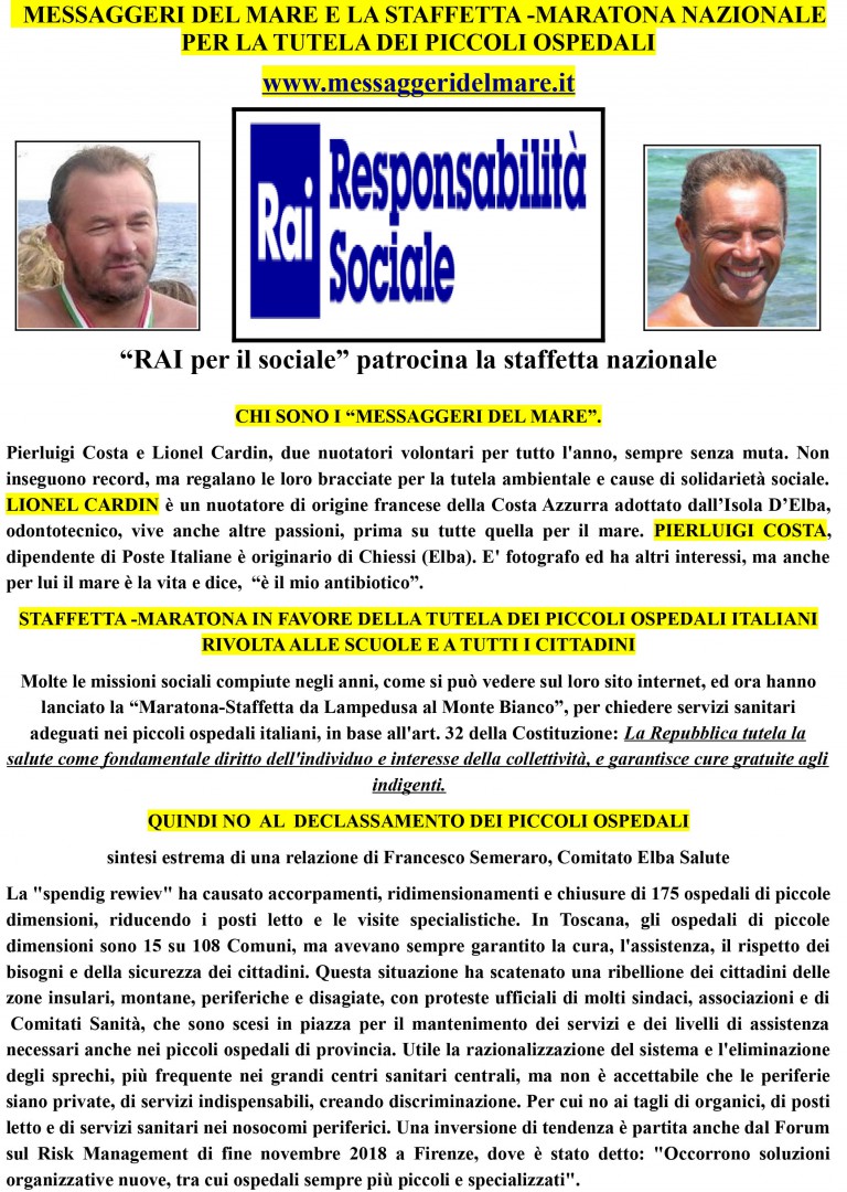Pronti i “Messaggeri del Mare” dell’isola d’Elba, e con loro centinaia di persone in tutta Italia, a far partire, dal primo aprile fino al 15 giugno, la “Staffetta in difesa dei piccoli ospedali italiani” patrocinata da Rai Responsabilità Sociale, ma in realtà il movimento per una sanità più equa proseguirà oltre, nel tempo. Intanto, sul Monte Rosa, 50 Maestri di sci (vedi foto), coordinati da Anna Comune e Giuseppe Lollio, hanno salutato la staffetta mettendo lo striscione dei Messaggeri del Mare in altura, a Sant’Anna a 2400 metri nel comune di Gressoney. Quindi da aprile tante tappe in tutto lo Stivale, dalla Sicilia alla Val d’Aosta animate da concerti, incontri con le scuole e in piazza, trekking, nuoto, ciclismo, corsa, scacchi, musica e rappresentazioni teatrali. Tanti eventi a cui parteciperanno studenti e cittadini per chiedere servizi sanitari adeguati nei piccoli ospedali, in base all’art. 32 della Costituzione: “La Repubblica tutela la salute come fondamentale diritto dell’individuo e interesse della collettività, e garantisce cure gratuite agli indigenti”. Una maxi manifestazione per lo Stivale dei due sportivi Pierluigi Costa e Lionel Cardin e il loro staff, tutti volontari. I due alfieri della solidarietà, come noto nuotano in ogni stagione, senza muta, e non vogliono fare record ma solo gustarsi la bellezza del mare, e segnalano, a suon di bracciate, problemi ambientali o sociali da risolvere. Hanno nuotato a Lampedusa, nel passato, per dire no alle morti dei migranti nel Mediterraneo, poi per raccogliere fondi per l’ospedale pediatrico Gaslini, per dire no alla plastica in mare e in generale all’inquinamento. Altre imprese visibili su www.messsageridelmare.it il loro sito internet. Ora è la volta di una missione nazionale per difendere i piccoli nosocomi, che sono fondamentali per le periferie d’Italia a cominciare da quello dell’isola d’Elba di Portoferraio. Questo il link da cliccare www.lastampa.it/