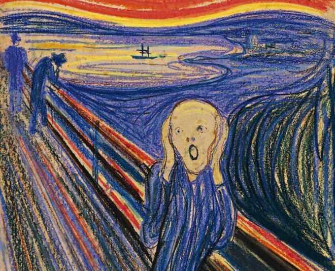 “Stavo camminando lungo la strada con due miei amici. Il sole tramontò – il cielo divenne rosso sangue. E mi sono sentito malinconico – Mi fermai, stanco morto – il blu-nero del fiordo e la città divennero sangue e lingue di fuoco. I miei amici continuarono a camminare – io rimasi fermo – tremando di paura – e sentii il grande “Urlo della natura” con queste parole Munch scrisse dell’ispirazione che l’aveva portato a dipingere L’Urlo.