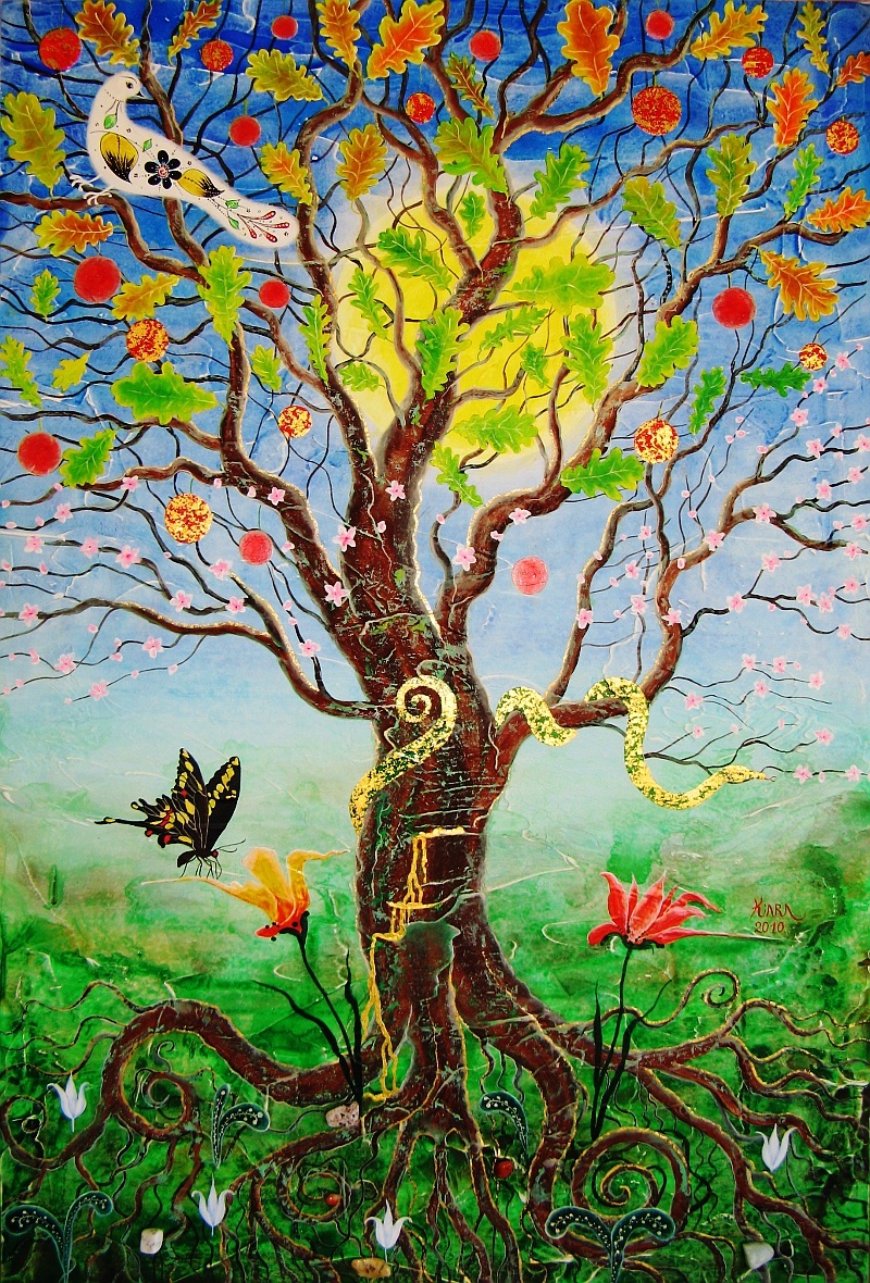 Tutte le esistenze, tutte le attività e tutte le regioni trovano posto sull’Albero della Vita. In epoche diverse dell’anno, le foglie, i fiori e i frutti cadono dall’albero; si decompongono e diventano humus che a poco a poco viene assorbito dalle radici. Gli “alberi della vita ”06:01 :ho scelto il colore verde simbolo della speranza!